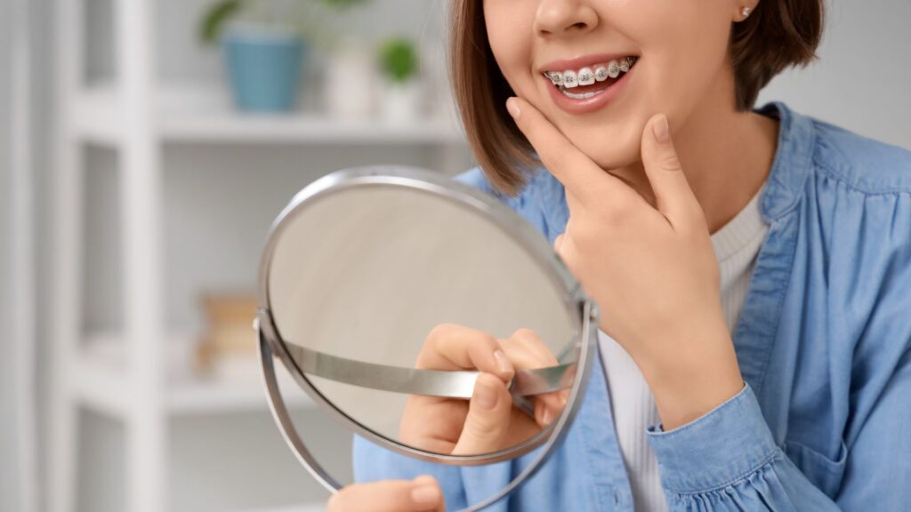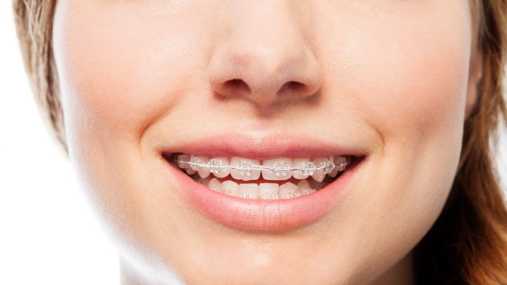 ワイヤー矯正:金属製のブラケットとワイヤーが目立つ。白いセラミック製や透明なブラケットを選べば多少目立ちにくくなるが、完全に隠すことは難しい。
